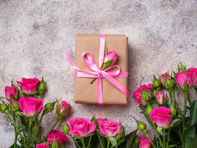 Обои Подарок на сером фоне с букетом розовых роз