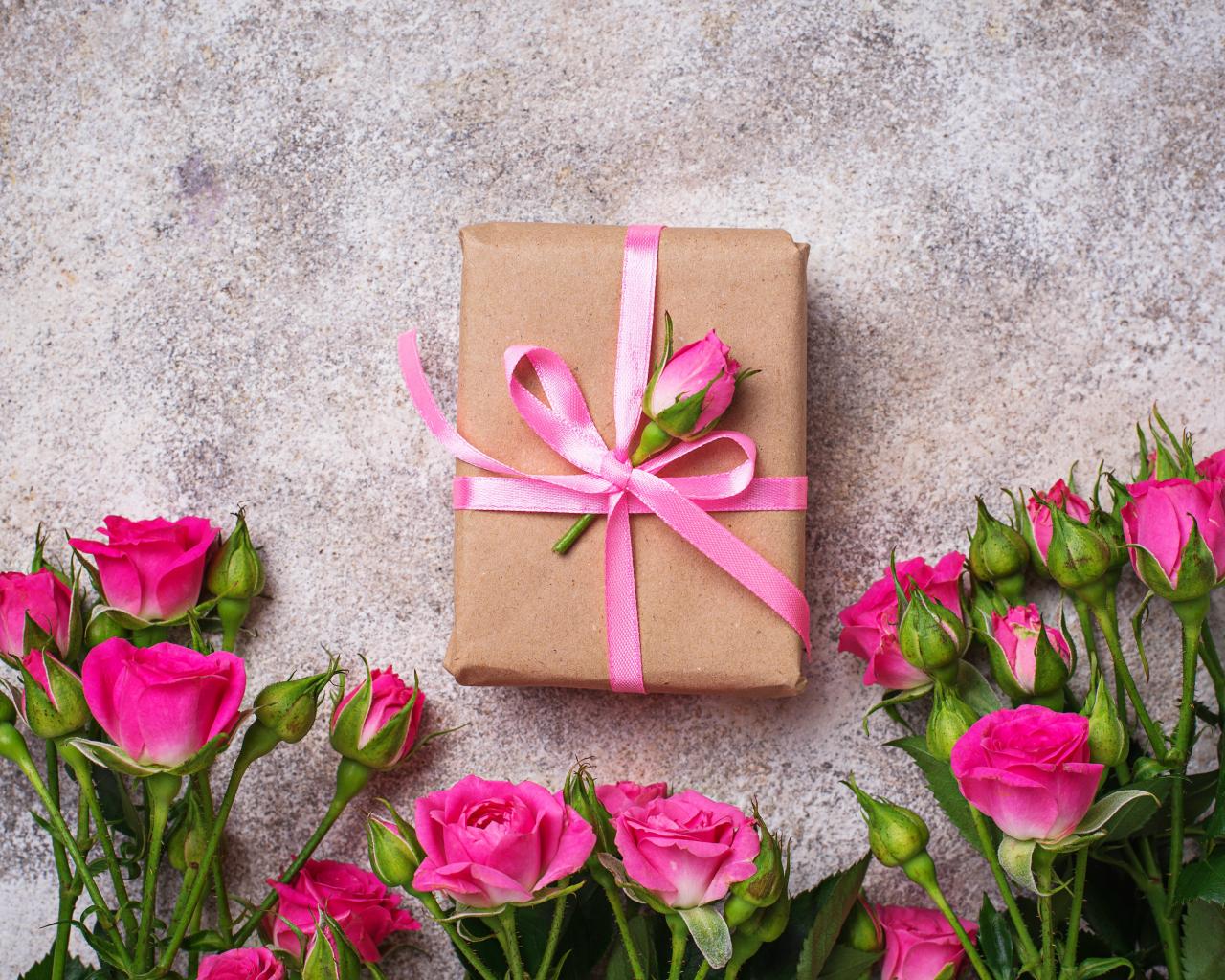 Обои Подарок на сером фоне с букетом розовых роз