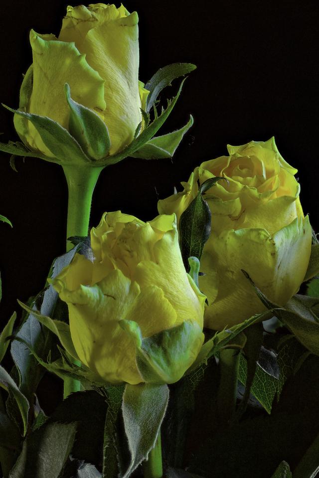 Обои Много желтых роз на черном фоне крупным планом