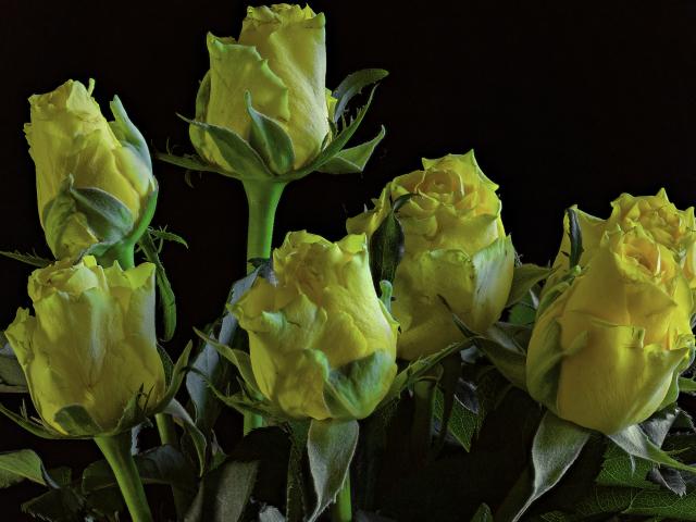 Обои Много желтых роз на черном фоне крупным планом