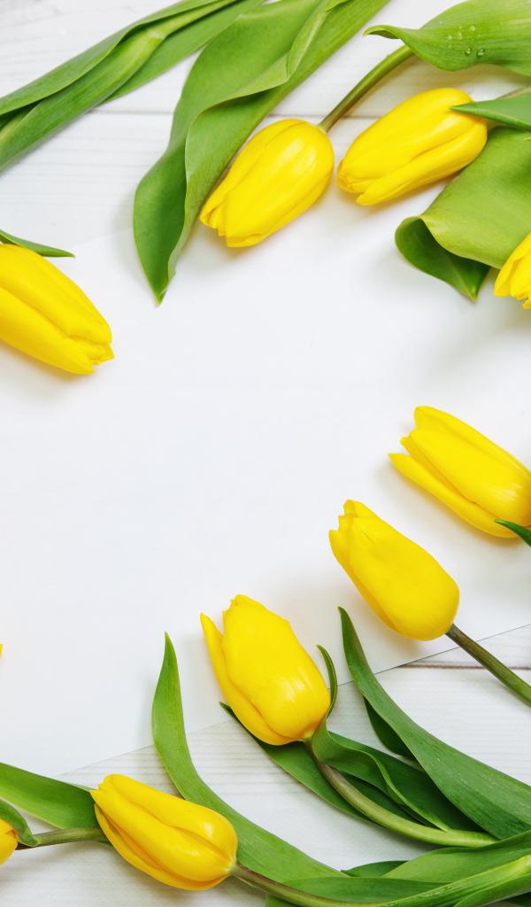 Обои Много желтых тюльпанов с зелеными листьями на сером столе