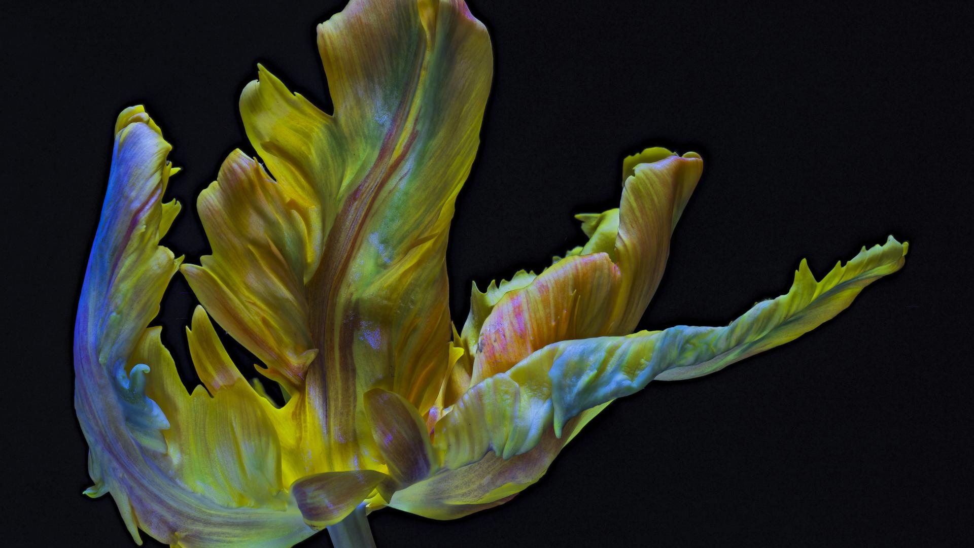 Обои Необычный тюльпан на черном фоне крупным планом