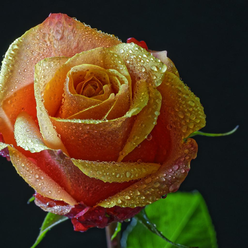 Обои Оранжевая роза в каплях росы на черном фоне