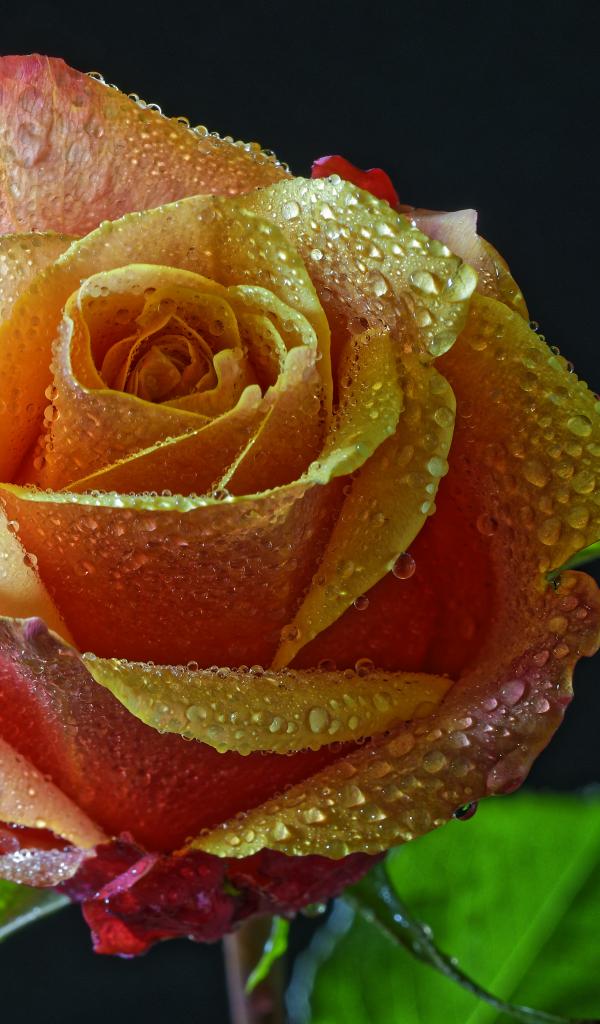 Обои Оранжевая роза в каплях росы на черном фоне