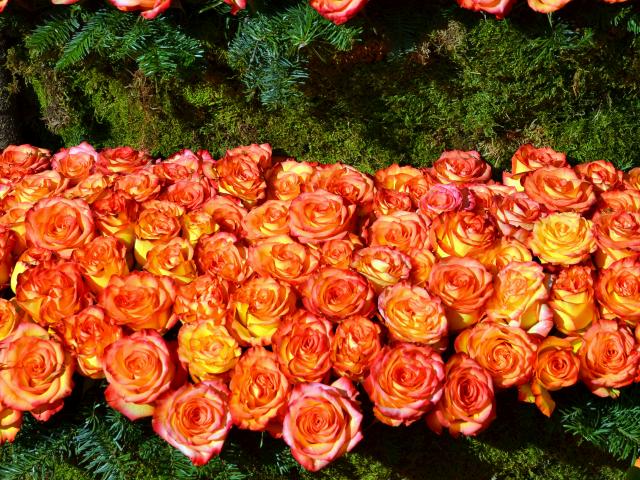 Обои Много оранжевых тюльпанов на фоне голубого неба