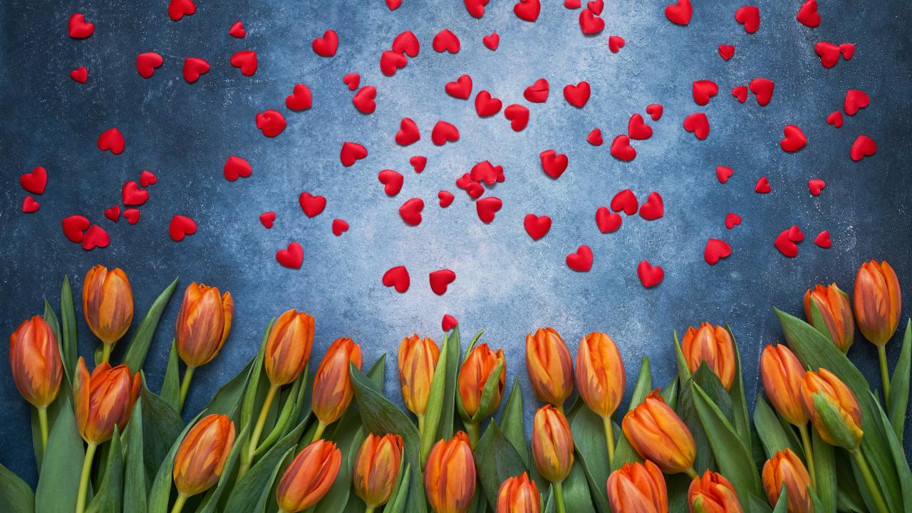 Обои Оранжевые тюльпаны на сером фоне с красными сердечками