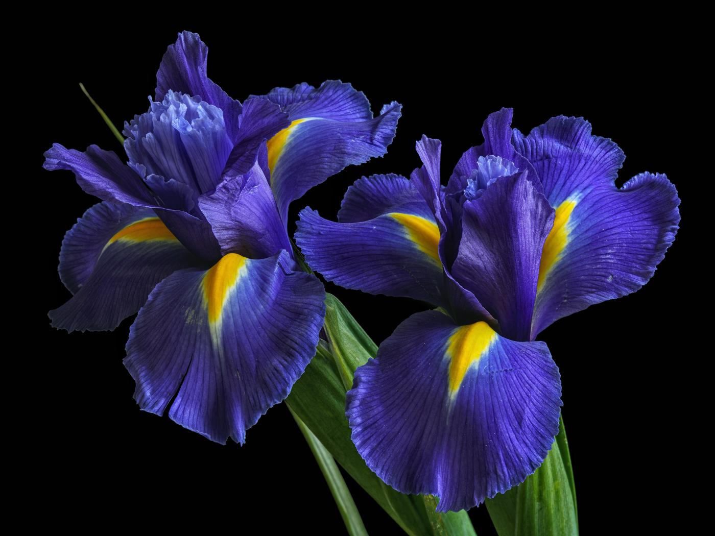 Обои Два синих красивых ириса на черном фоне