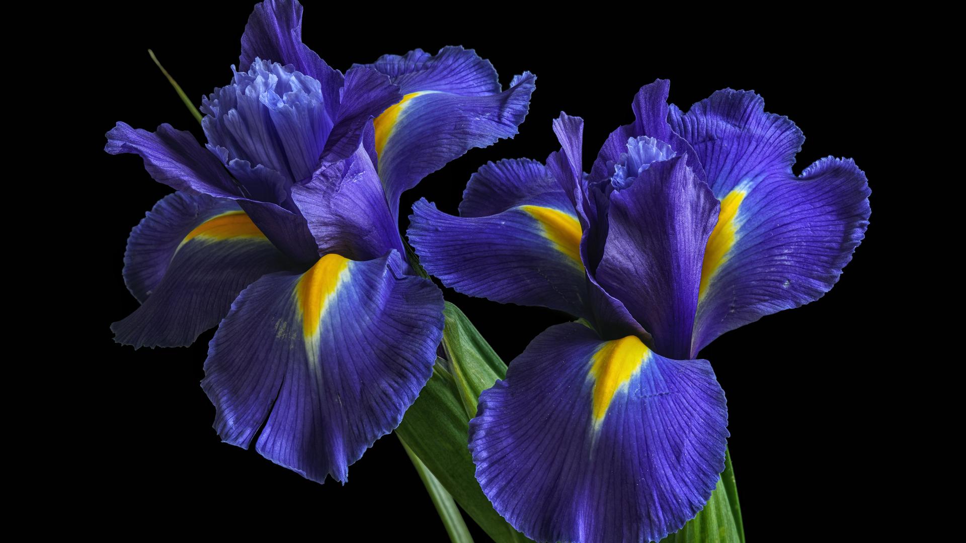 Обои Два синих красивых ириса на черном фоне