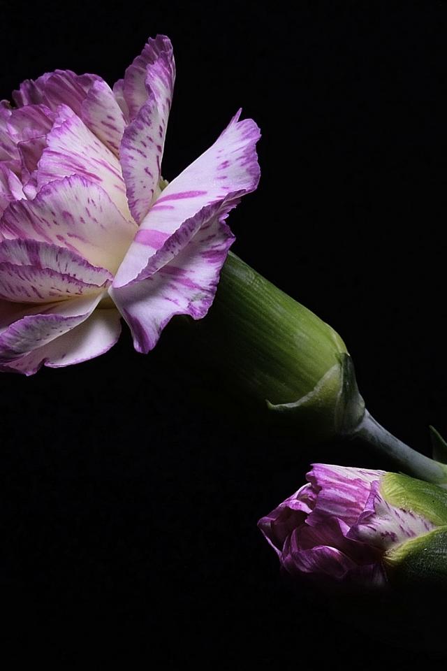 Обои Розовая гвоздика с бутоном на черном фоне