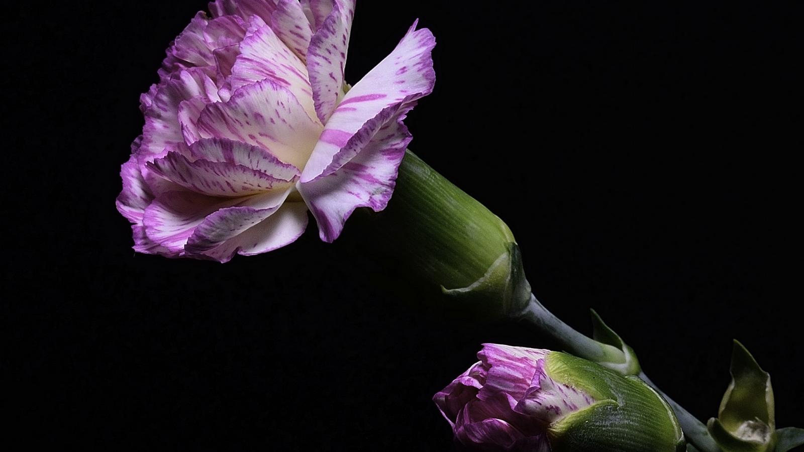 Обои Розовая гвоздика с бутоном на черном фоне