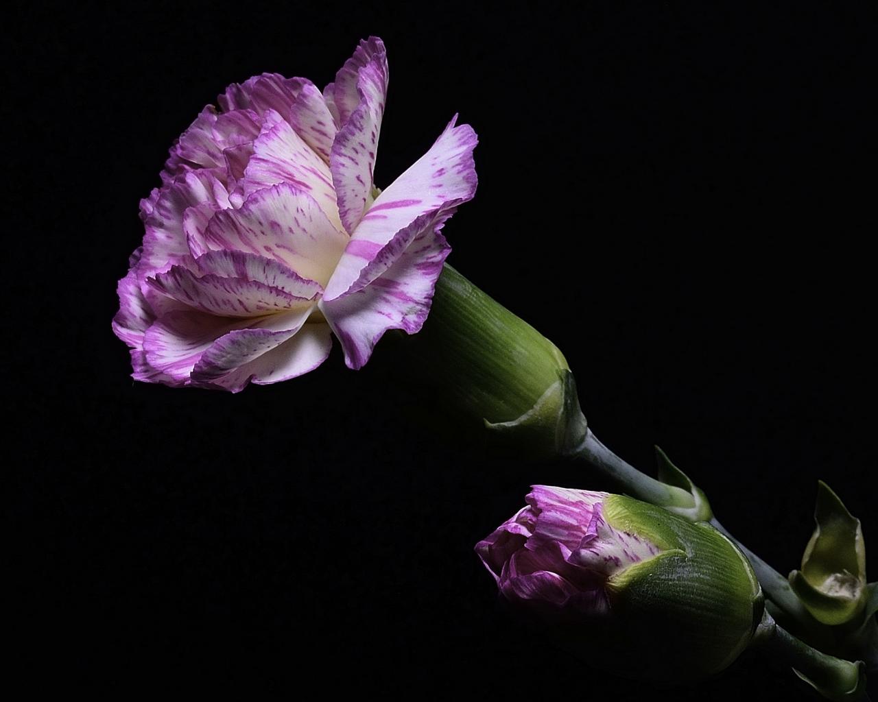 Обои Розовая гвоздика с бутоном на черном фоне