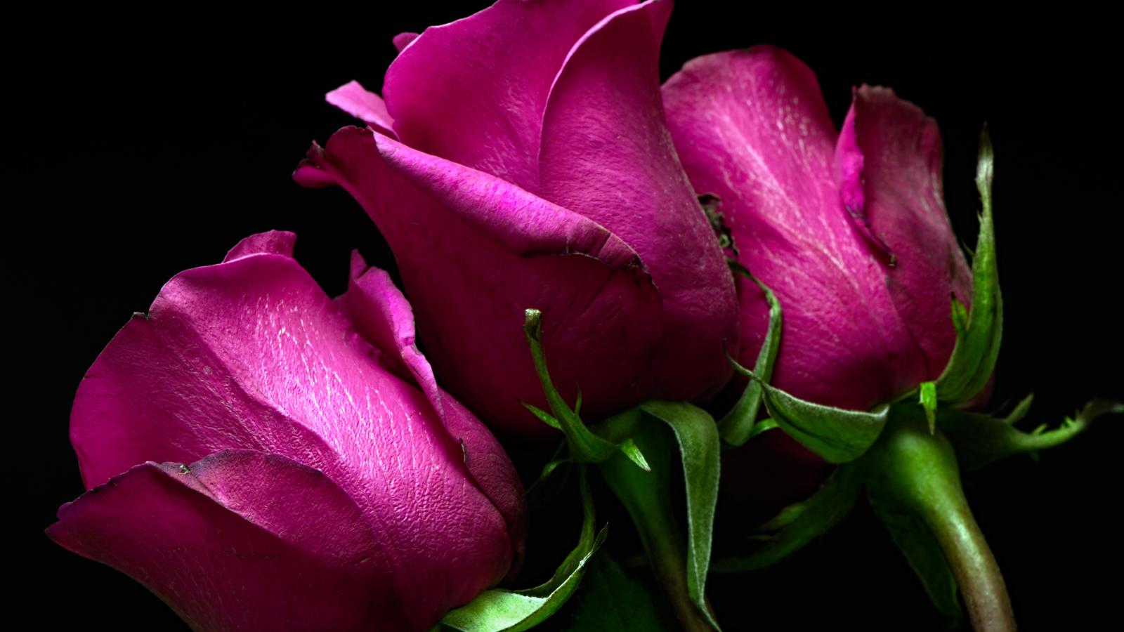Обои Три розовые розы на черном фоне