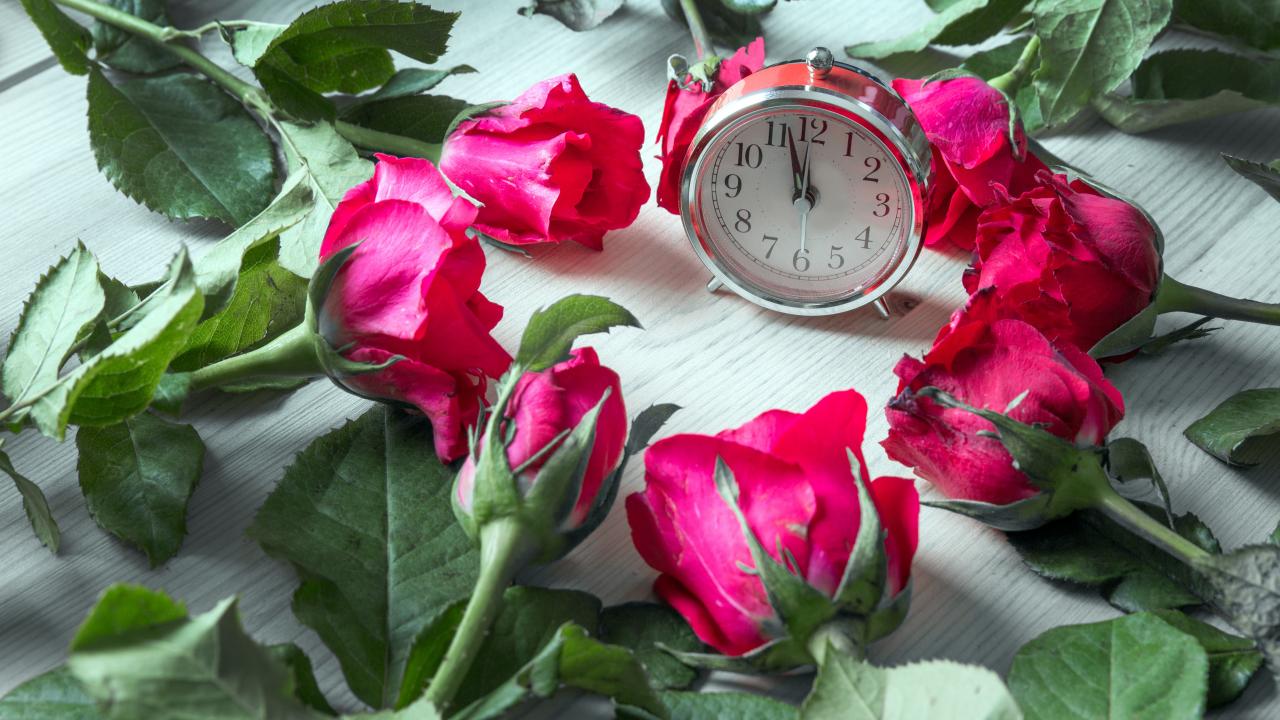 Обои Будильник и красные розы на столе