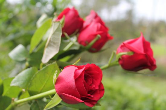 Обои Красивые алые тюльпаны в лучах солнца на клумбе
