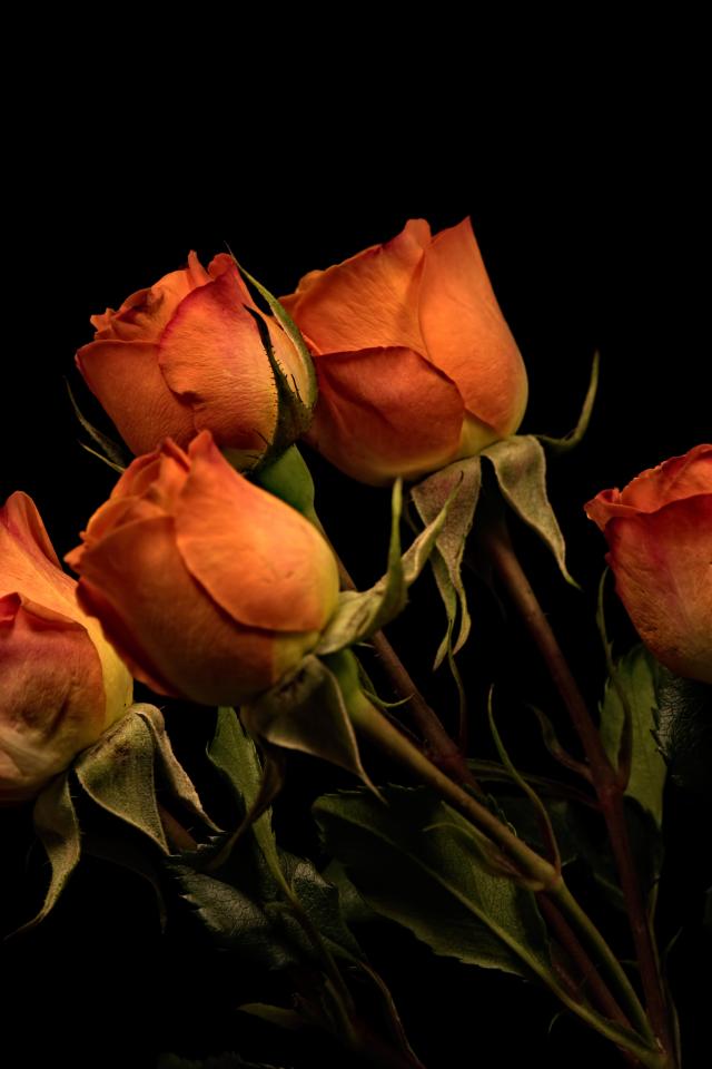 Обои Пять оранжевых роз на черном фоне