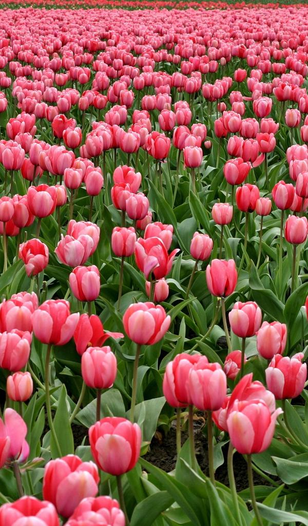 Обои Много красивых розовых тюльпанов на поле