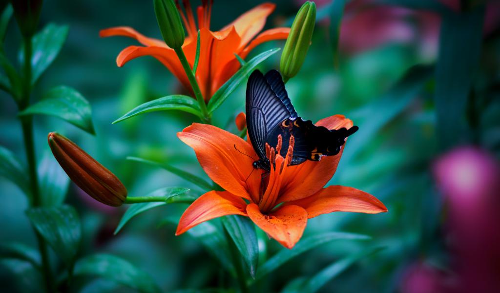 Обои Черная бабочка сидит на оранжевой лилии