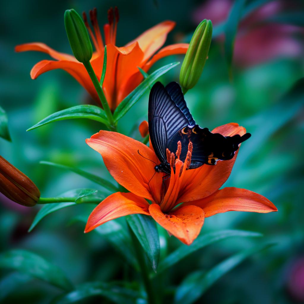 Обои Черная бабочка сидит на оранжевой лилии
