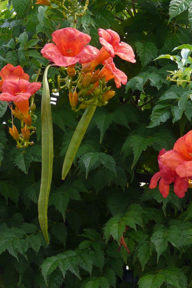Обои Красные цветы кампсис на кусте с зелеными листьями