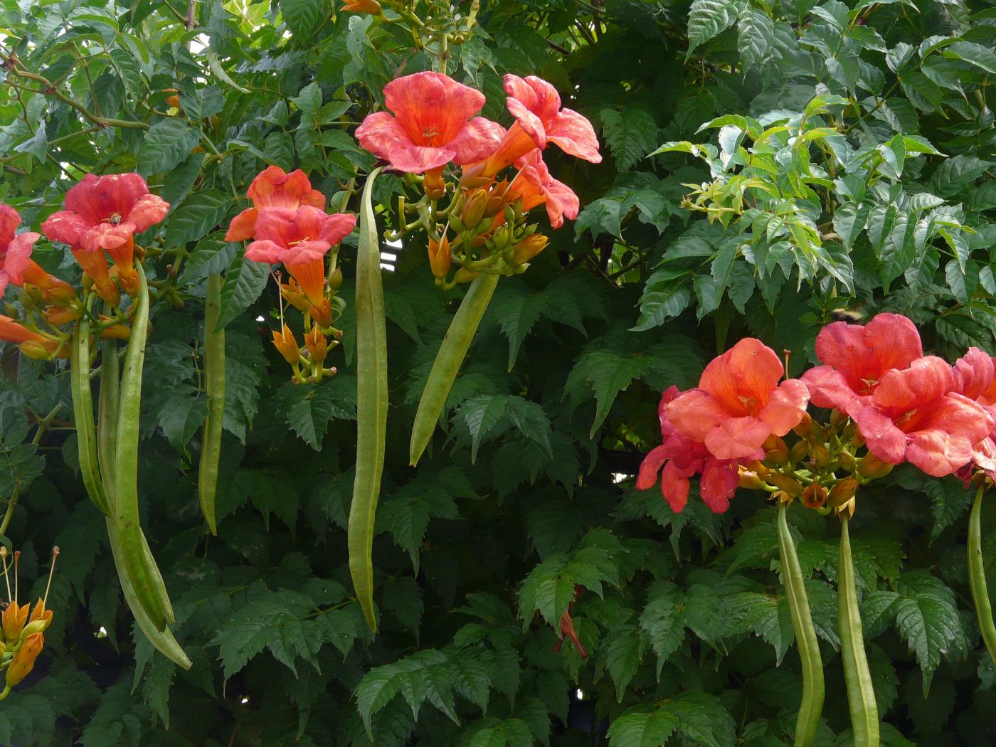 Обои Красные цветы кампсис на кусте с зелеными листьями