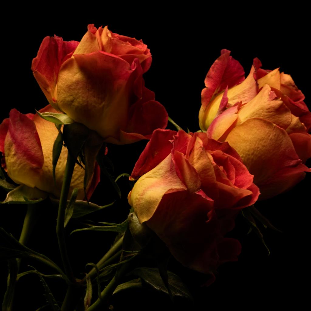 Обои Букет оранжевых с красным роз на черном фоне