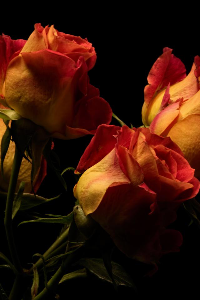 Обои Букет оранжевых с красным роз на черном фоне