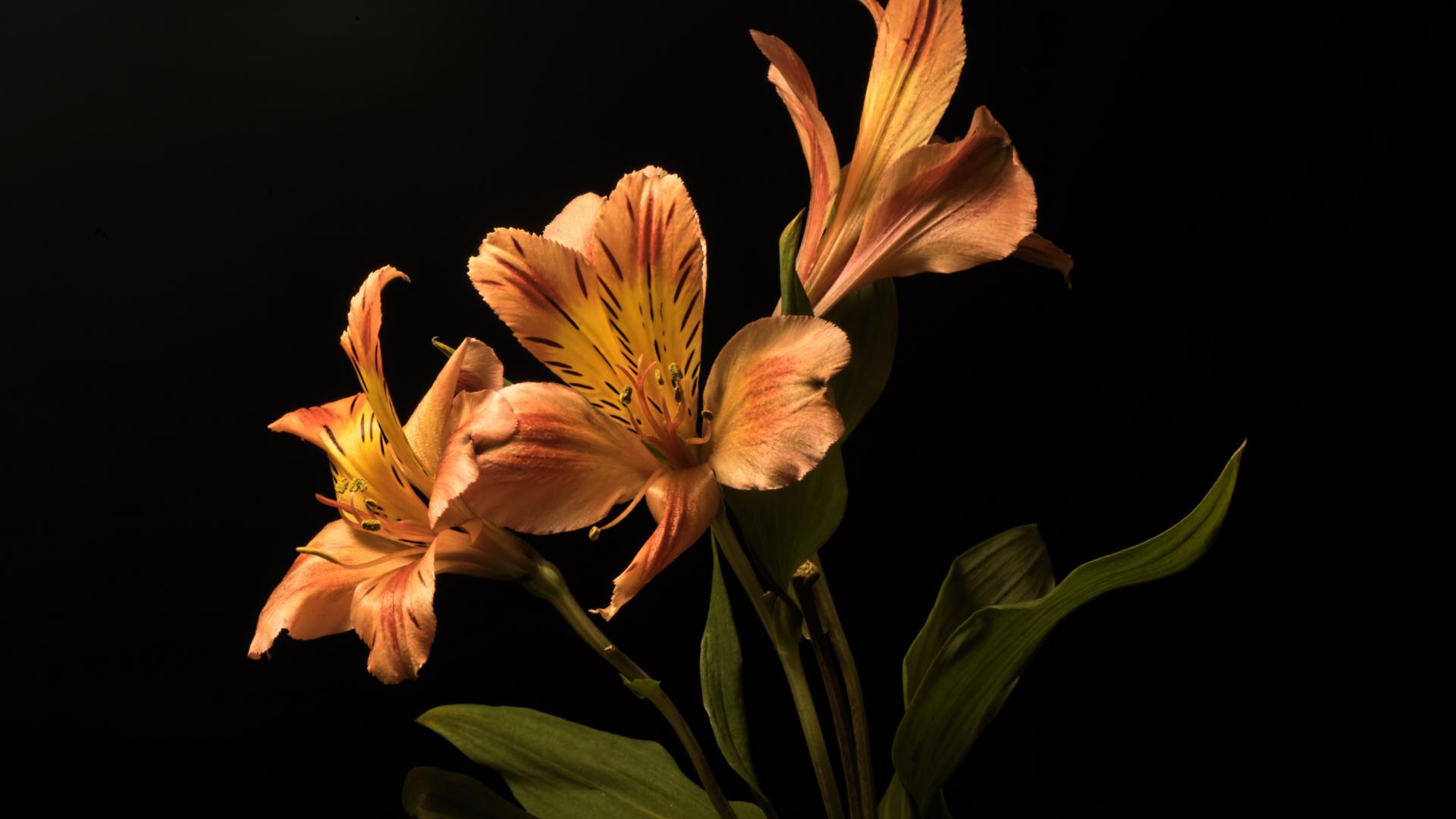Обои Оранжевые цветы альстромерия на черном фоне
