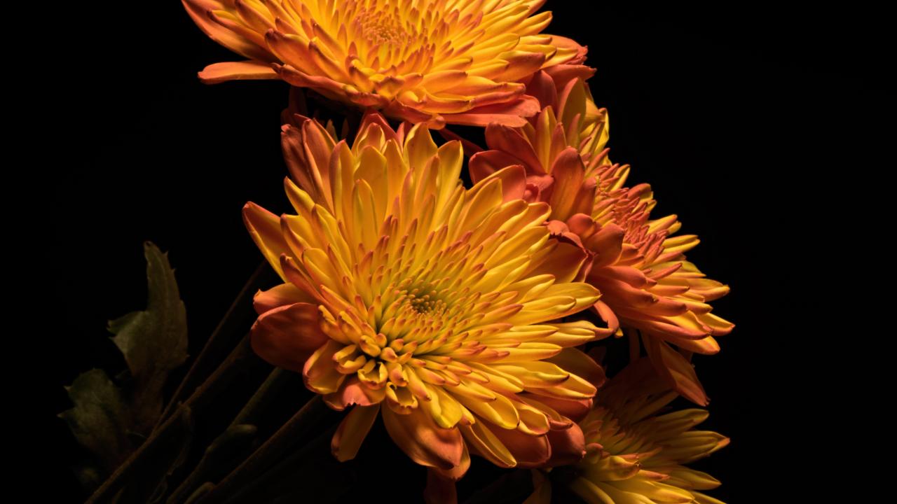 Обои Красивые оранжевые хризантемы на черном фоне