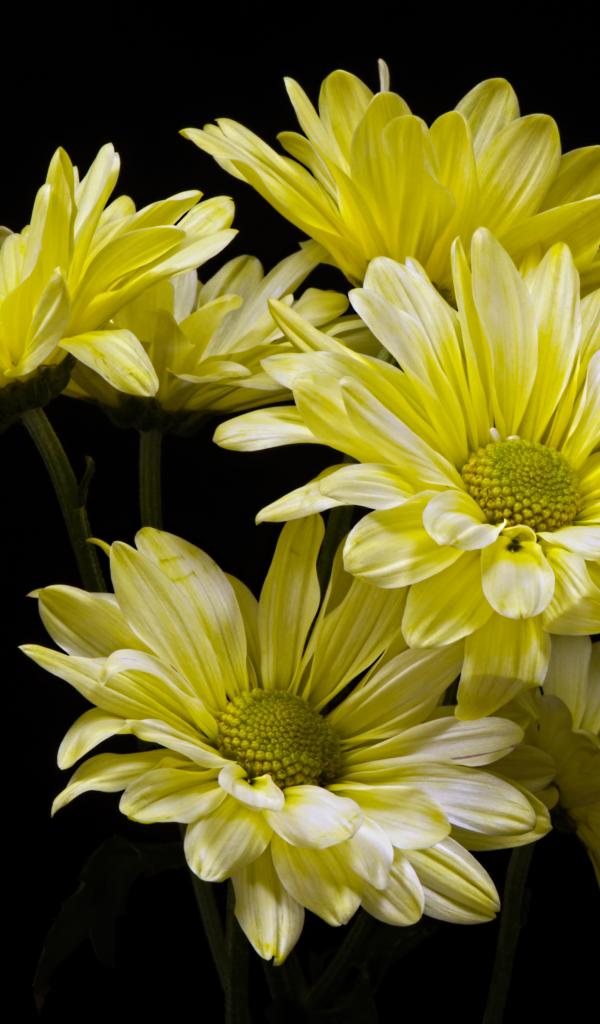 Обои Желтые ромашковидные хризантемы на черном фоне