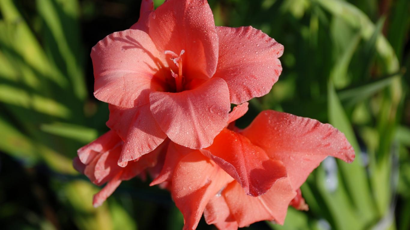 Обои Нежные цветы гладиолуса в каплях росы