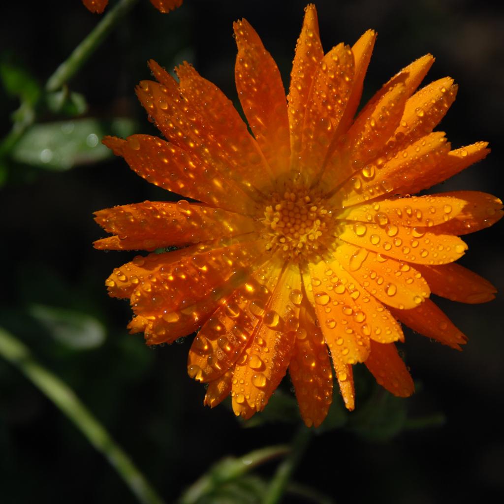 Обои Оранжевый цветок календула в каплях росы