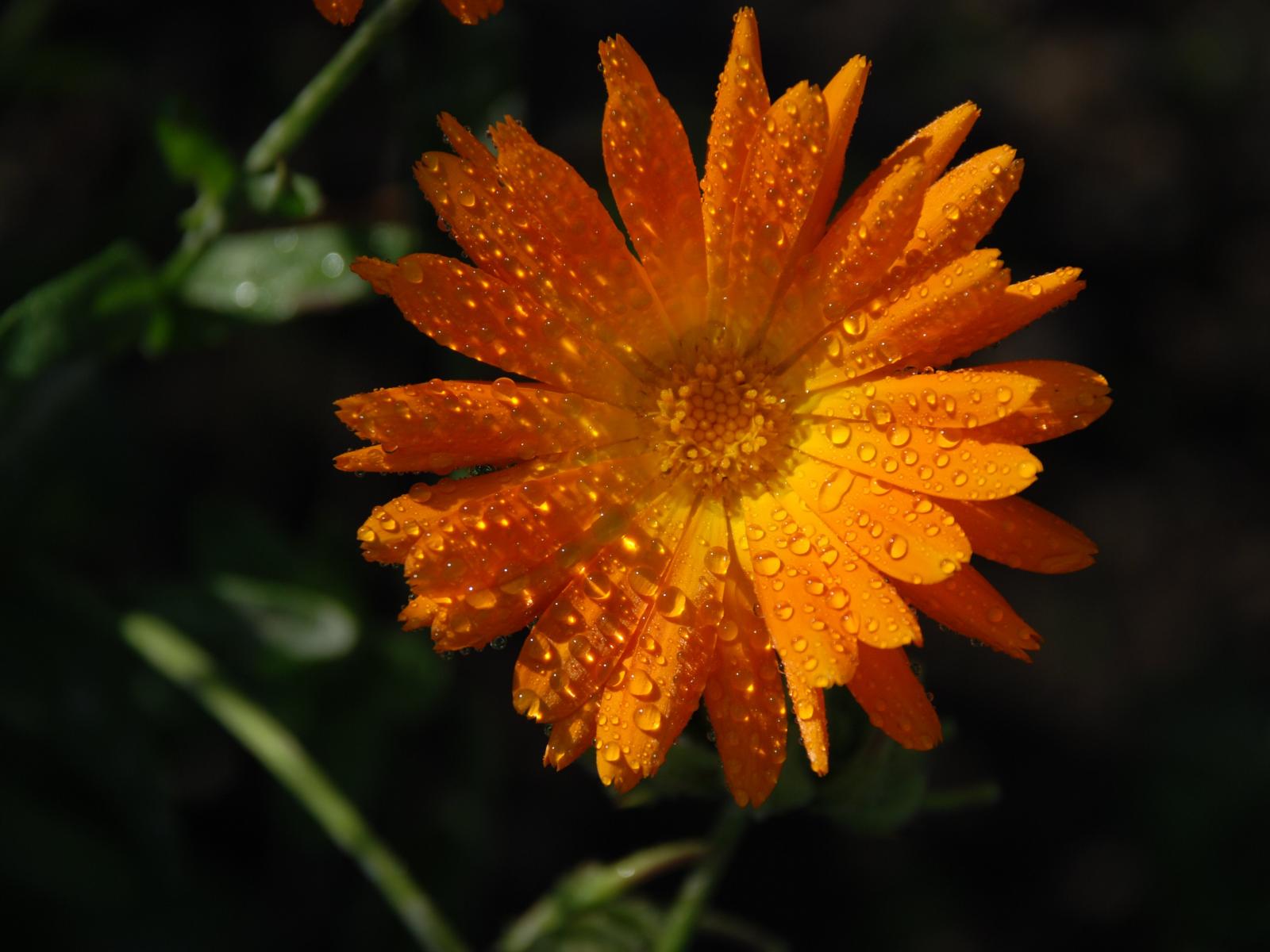 Обои Оранжевый цветок календула в каплях росы