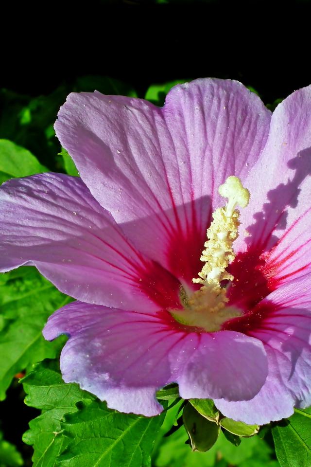 Обои Красивый розовый цветок гибискуса с зелеными листьями