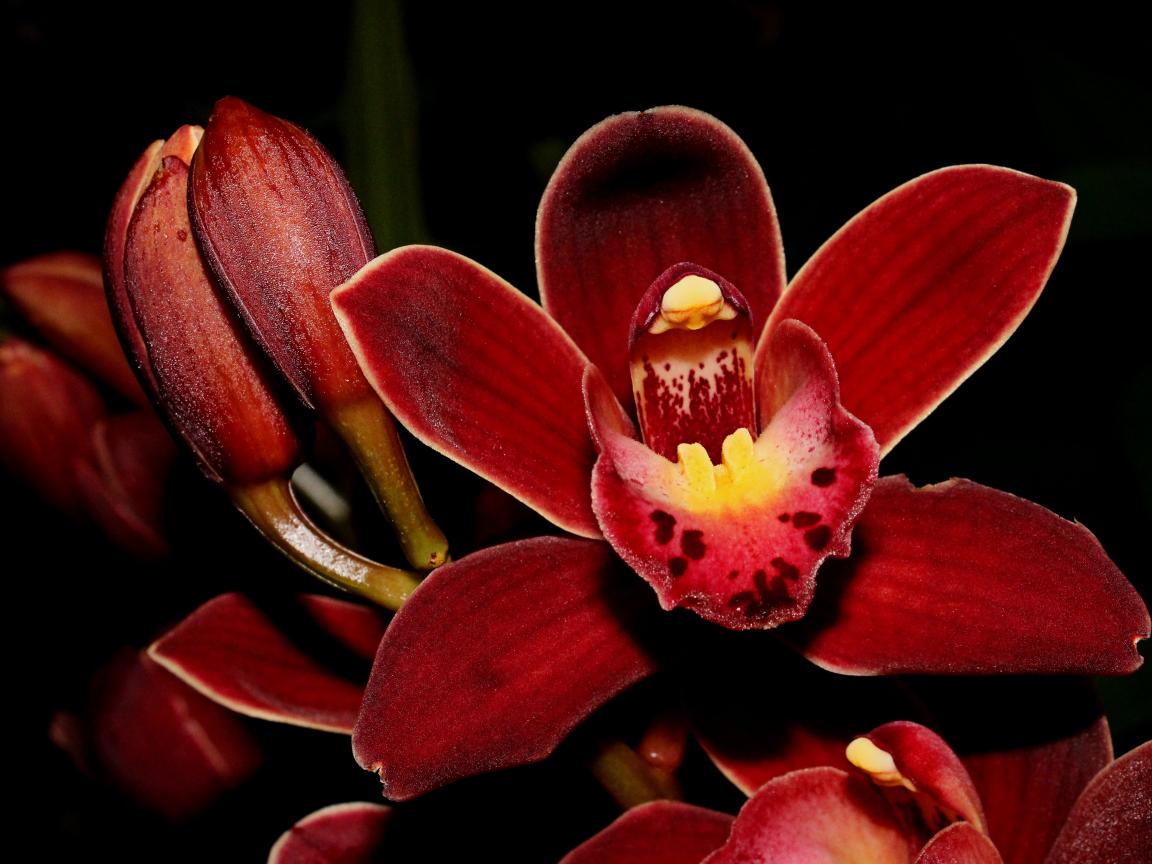 Обои Красные экзотические орхидеи с бутонами на черном фоне