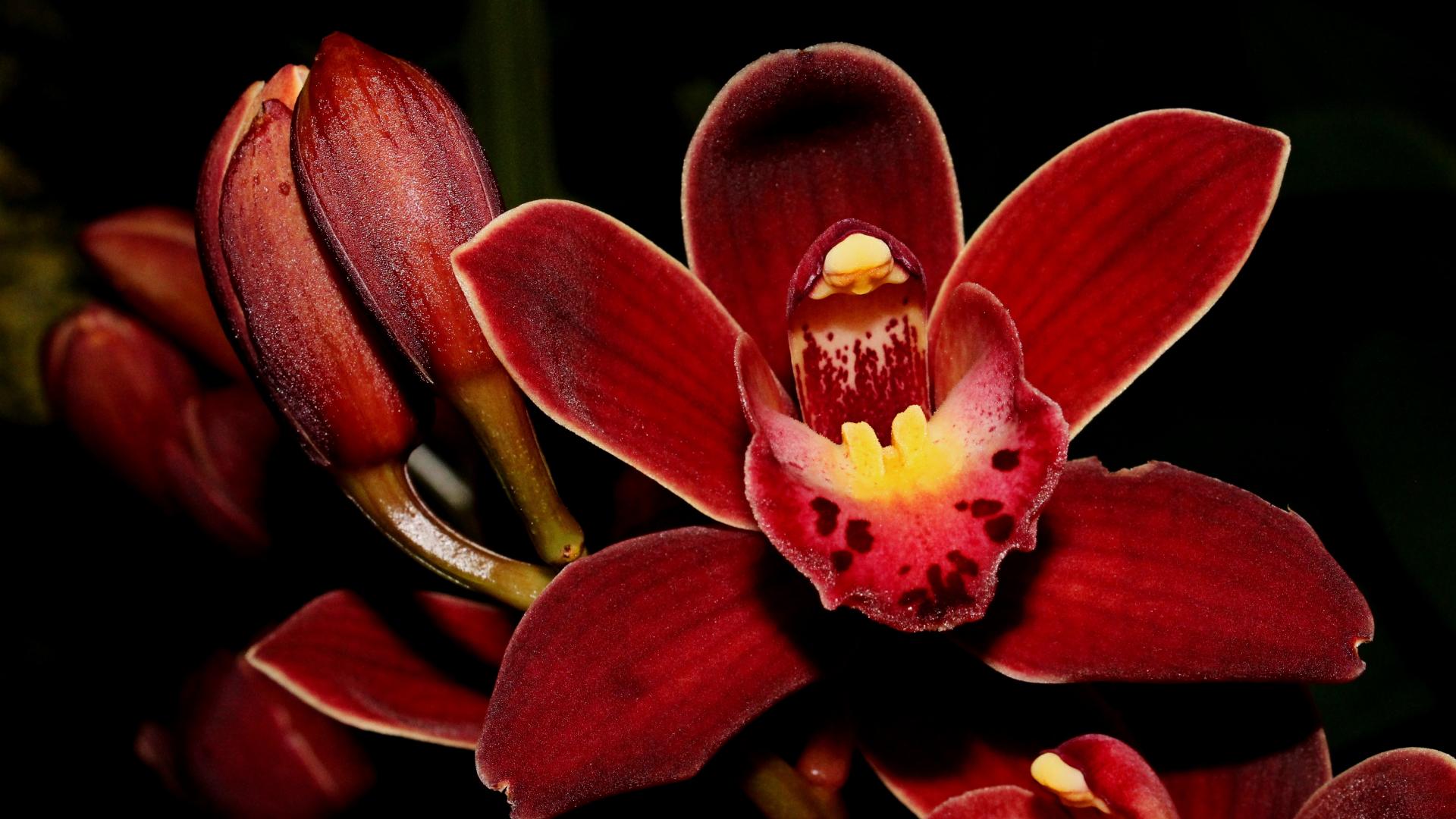 Обои Красные экзотические орхидеи с бутонами на черном фоне