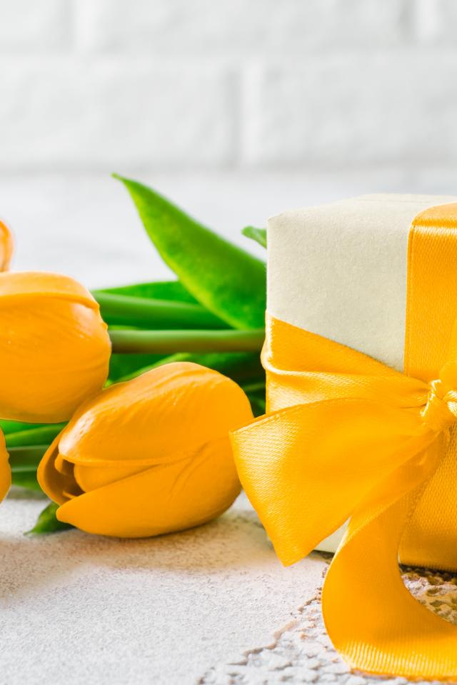 Обои Красивый букет желтых тюльпанов с подарком