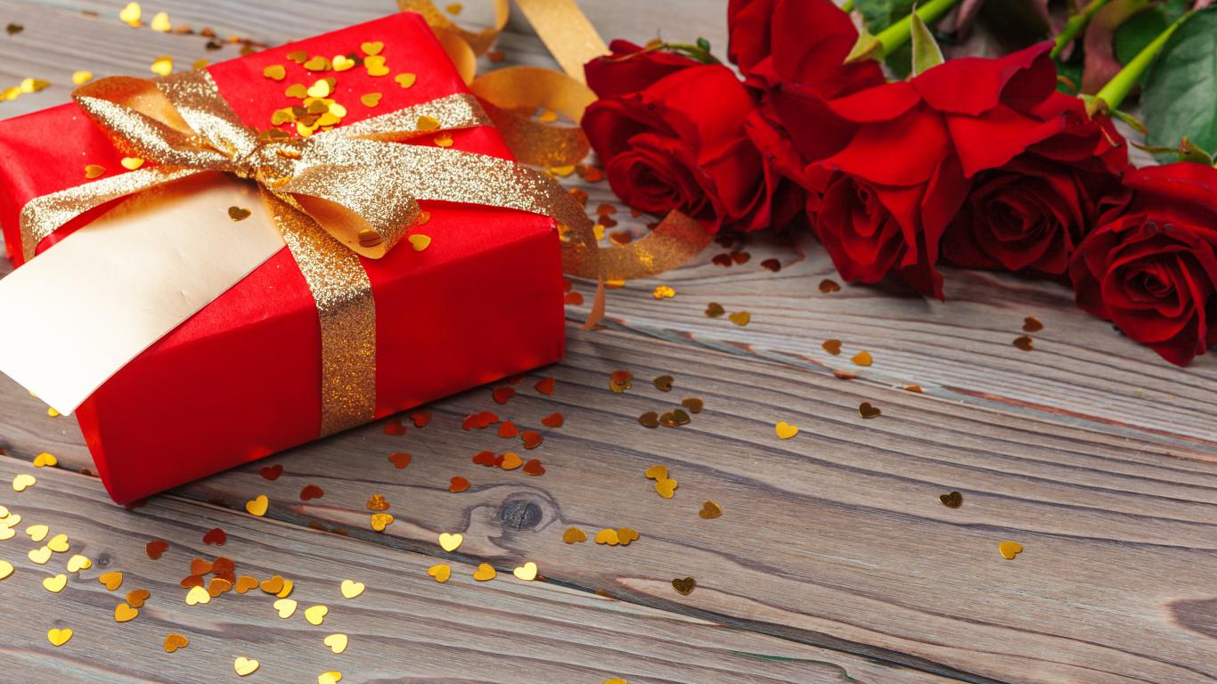 Обои Букет красный роз с большим подарком на столе