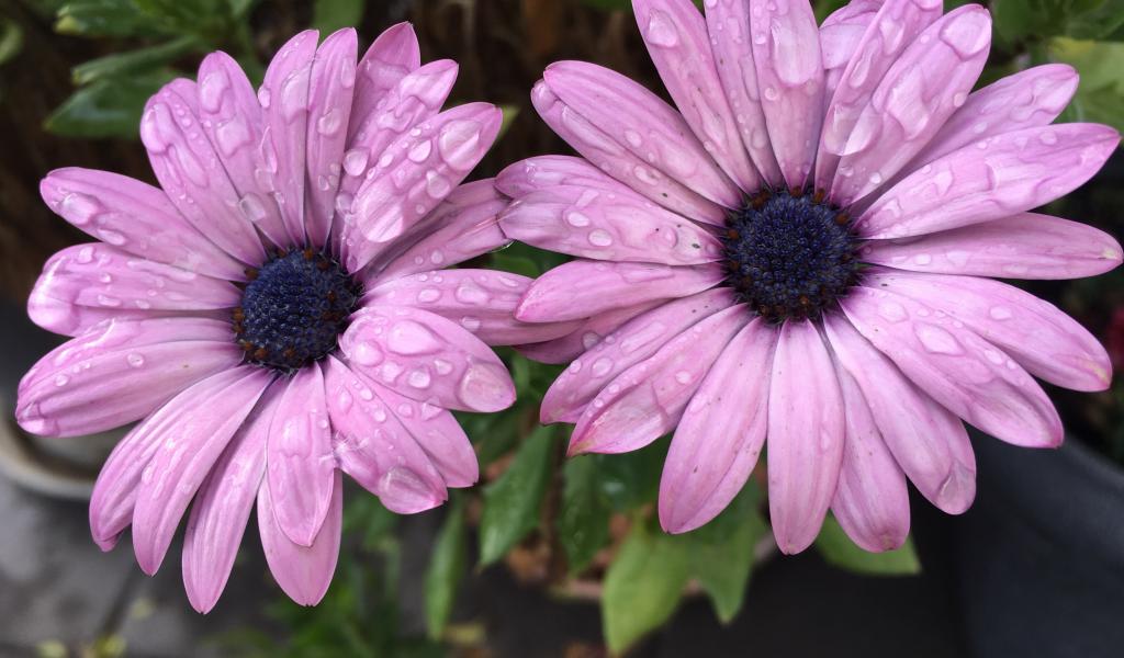 Обои Два сиреневых цветка остеоспермум в каплях дождя