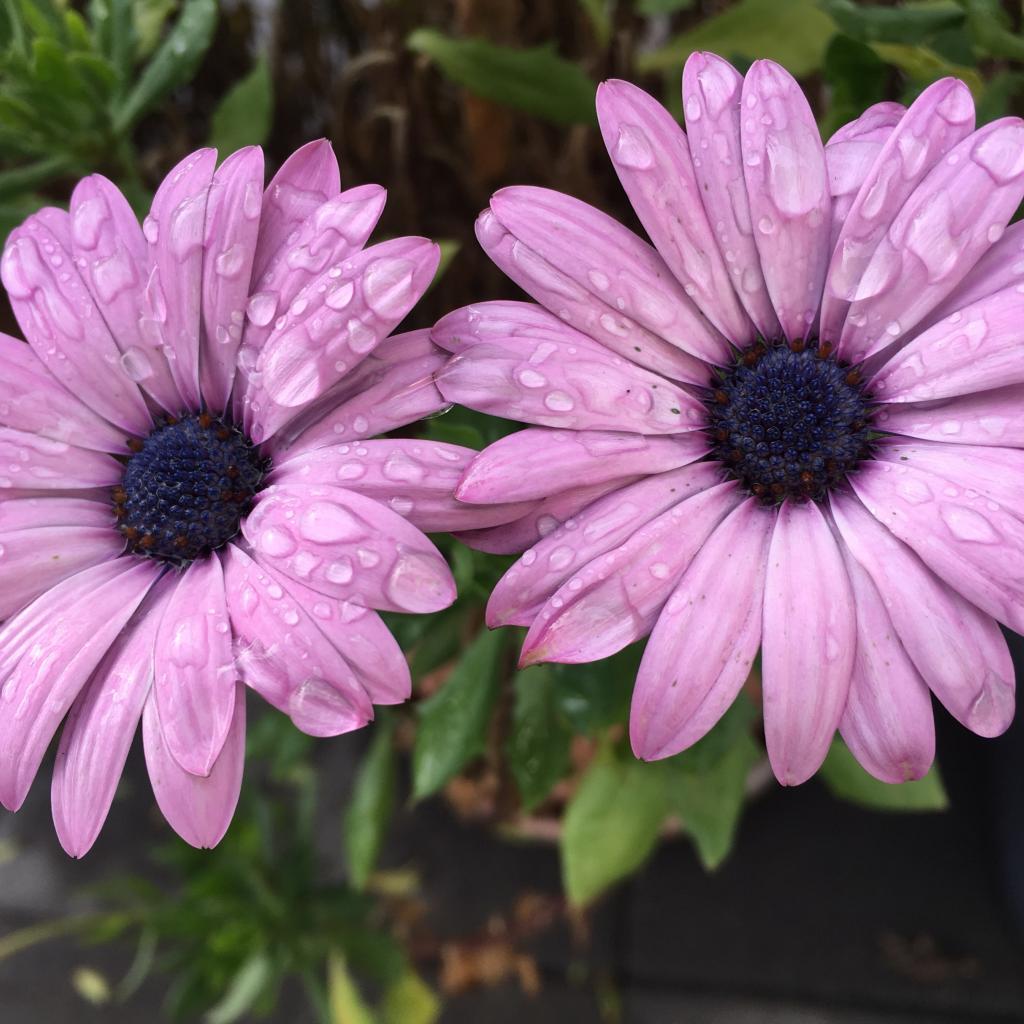 Обои Два сиреневых цветка остеоспермум в каплях дождя