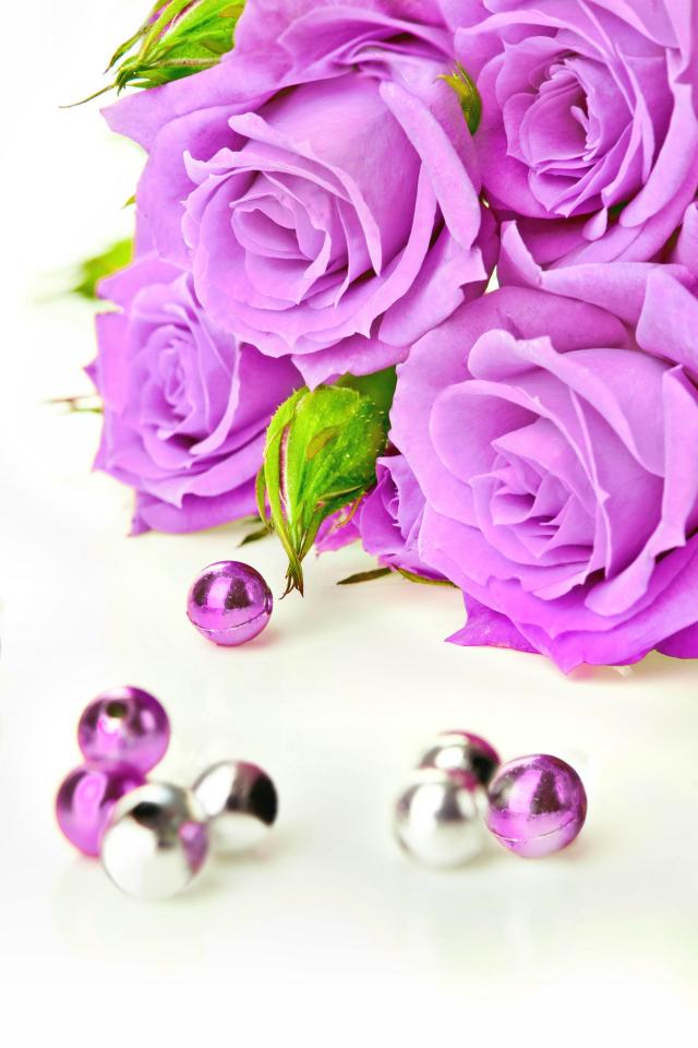 Обои Красивые сиреневые розы на белом фоне с бусинами