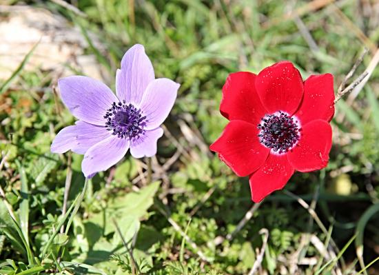 Обои Красный и сиреневый цветок анемоны в траве