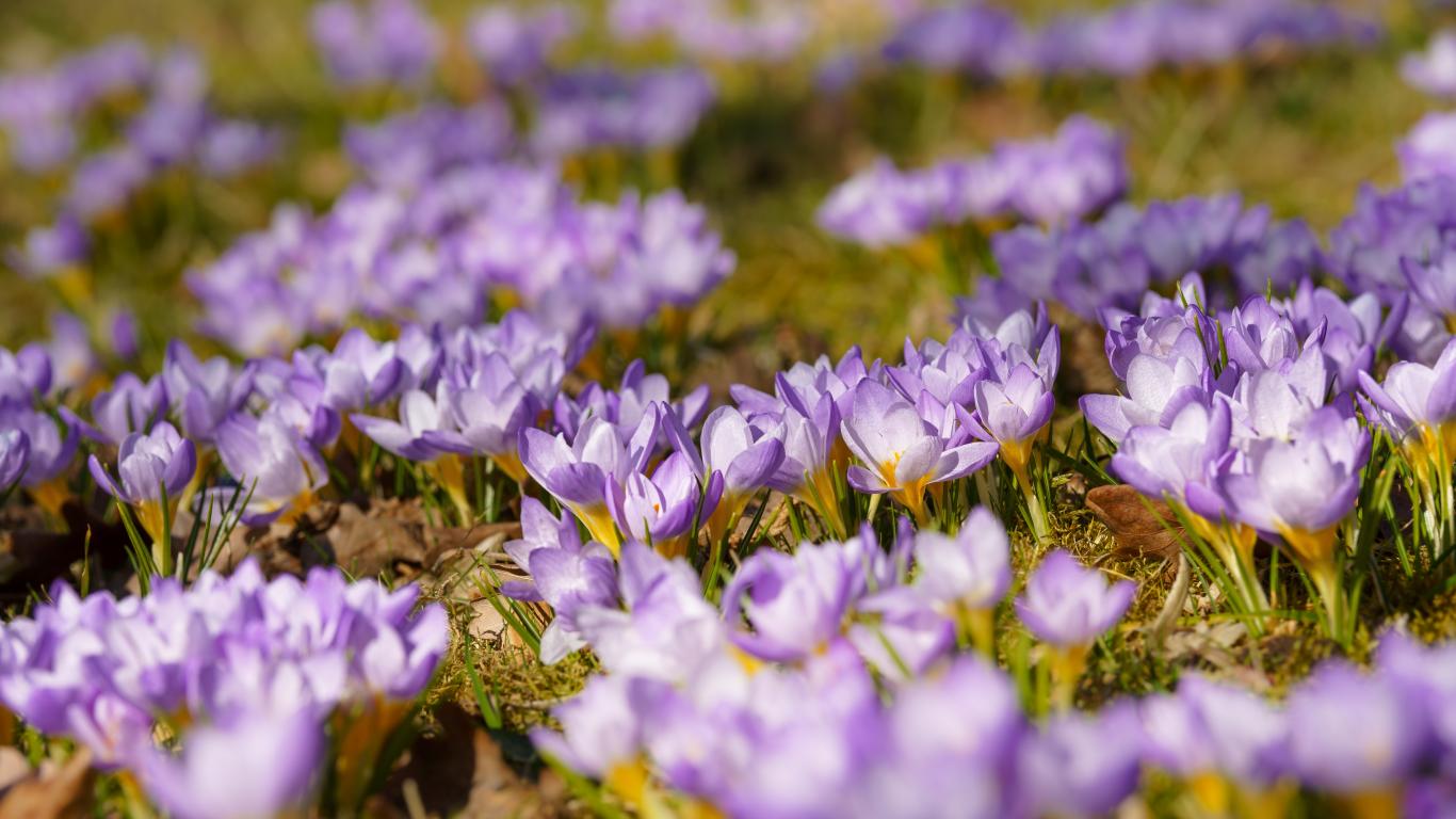 Обои Много красивых сиреневых цветов крокуса на поляне