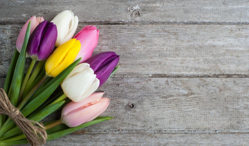 Обои Букет разноцветных тюльпанов на деревянном столе