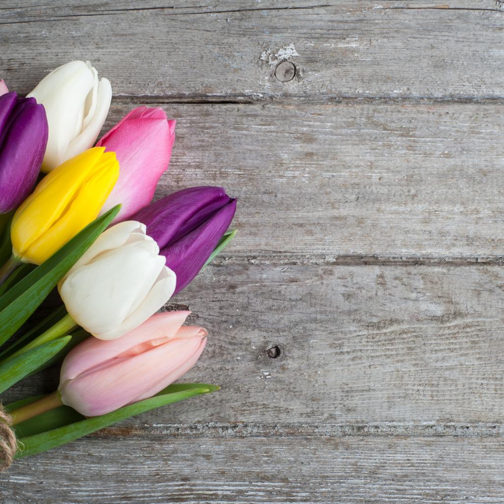 Обои Букет разноцветных тюльпанов на деревянном столе