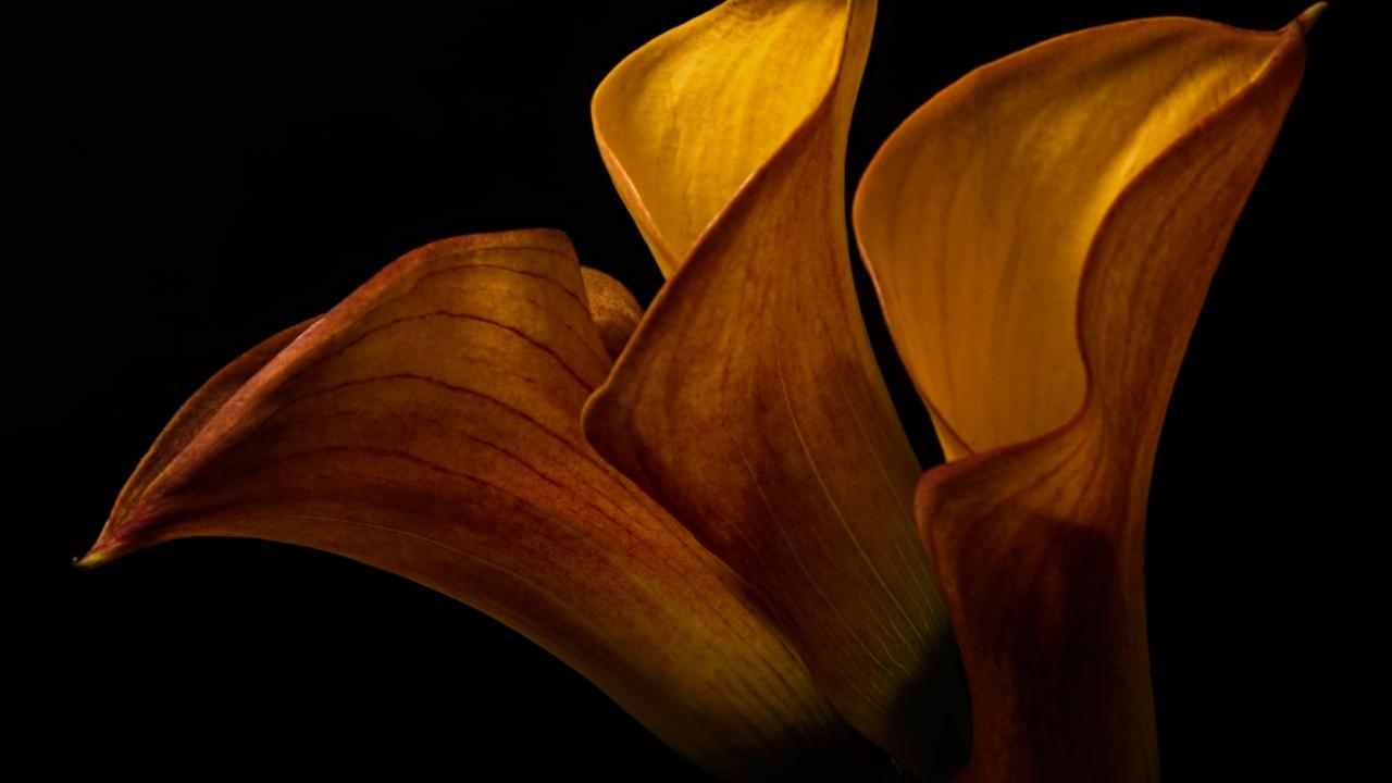 Обои Оранжевые цветы каллы на черном фоне крупным планом