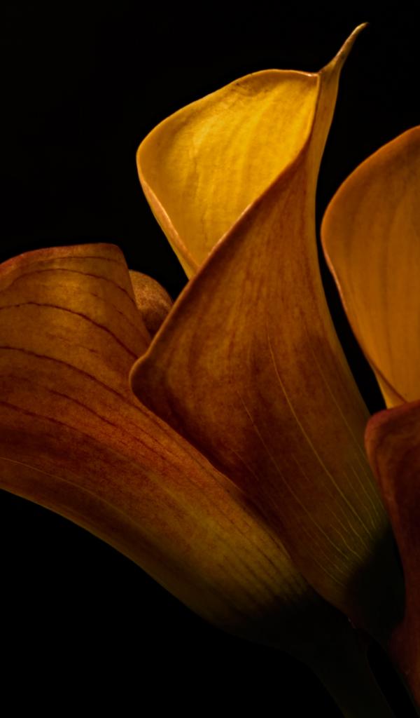 Обои Оранжевые цветы каллы на черном фоне крупным планом