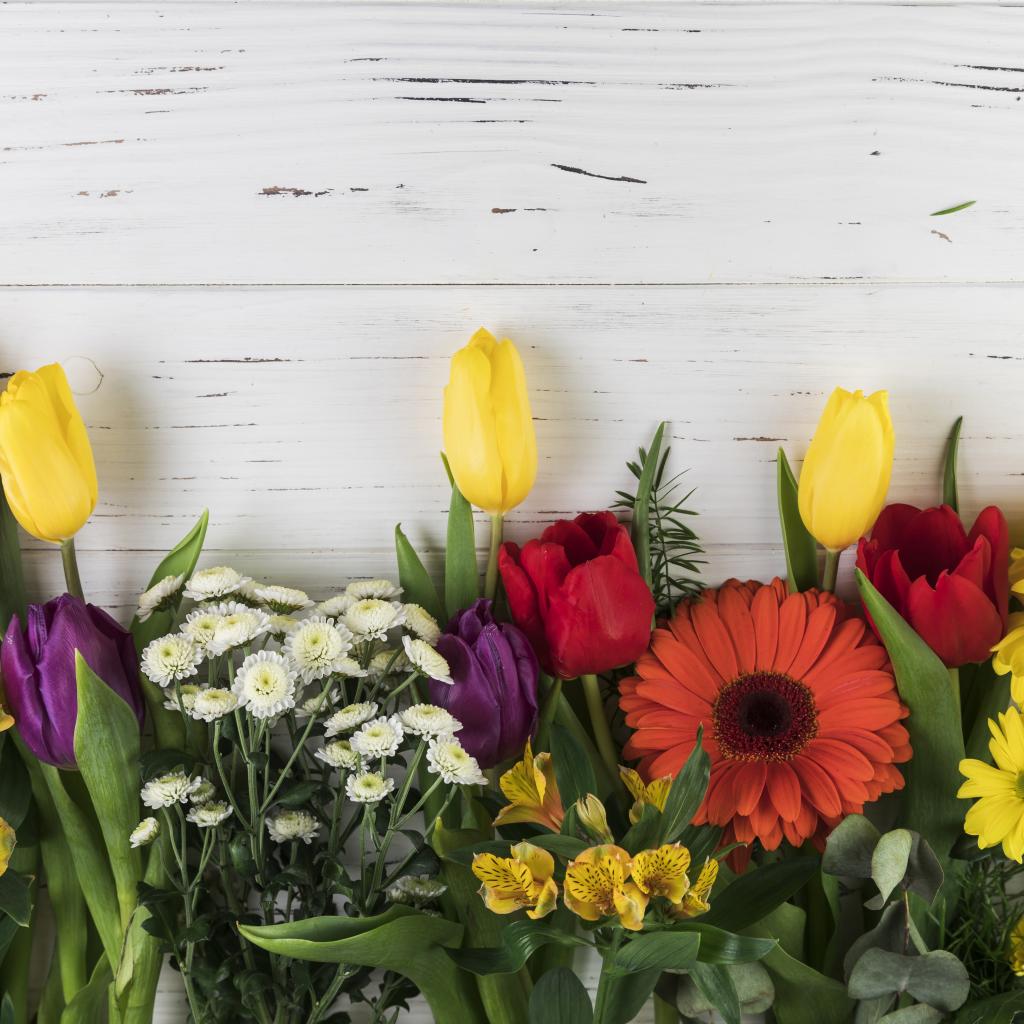 Обои Цветы альстромерии, тюльпанов и георгин на белом фоне