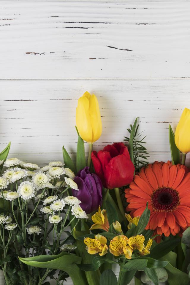 Обои Цветы альстромерии, тюльпанов и георгин на белом фоне