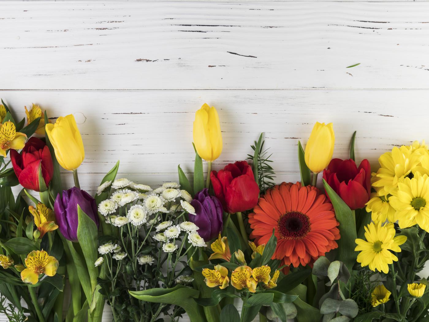Обои Цветы альстромерии, тюльпанов и георгин на белом фоне