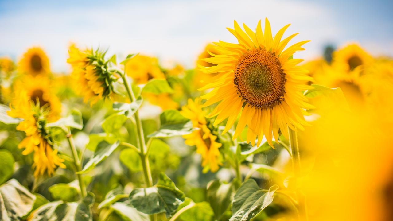Обои Желтые лепестки подсолнухов в лучах яркого солнца